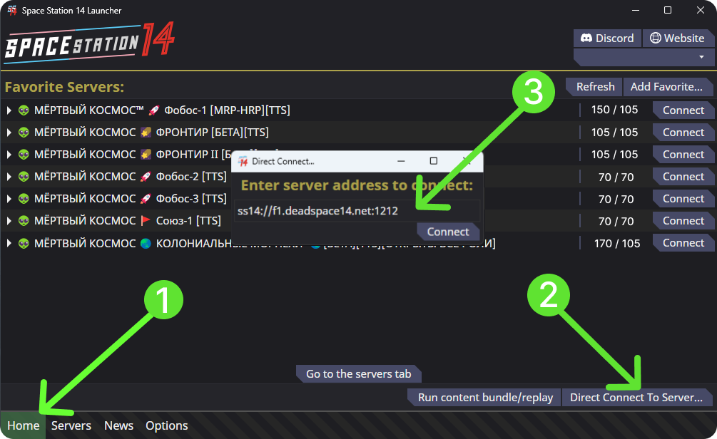 В разделе Home в панели Direct Connect To Server вы можете подключится на прямую через IP адреса наших серверов.